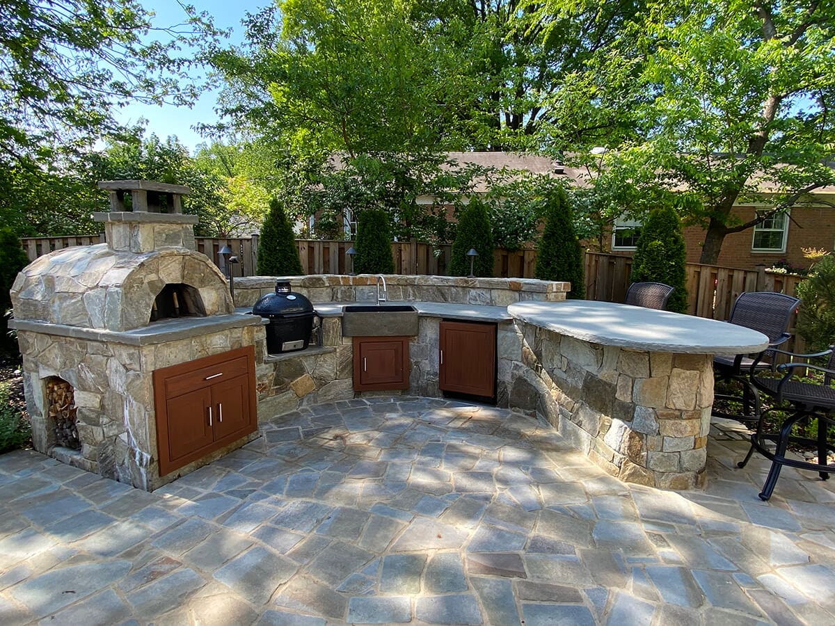 - The outdoor kitchen area is a third of a circle in shape. One side has a wood-fired oven with a gas starter and storage. There is also a ceramic egg smoker, a must-have for Chad. The kitchen sink is carved of stone similar to the fire table, with a refrigerator and elevated island attached to it. The countertops are blue granite.
