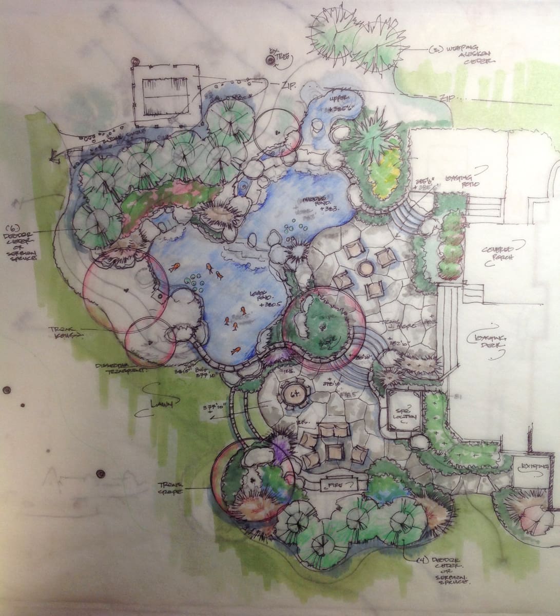 When Andy and Carolyn bought their Vienna Virginia home it came with a koi pond that, as they found out, wasn’t so well designed. Every winter the pond would freeze and the fish would die because the pond was too shallow. It wasn’t much to look at either. Two murky bath tubs connected by a piece of PVC pipe, that’s how Andy described it. Even so, he liked it: “I always found it peaceful and I liked the fish”.