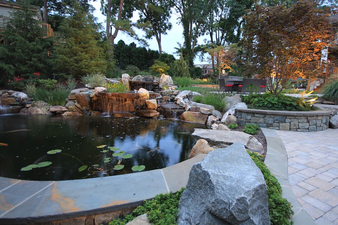 Another reason is that a waterfall naturally provides circulation and some of the aeration that pond fish need. But this alone can’t keep water clean enough. For a koi pond, water clarity is essential to the health of the fish. An appropriately sized filtration system is required to clean debris from the pond water and control algae growth. Regular maintenance is needed to ensure proper Ph levels and water temperature.