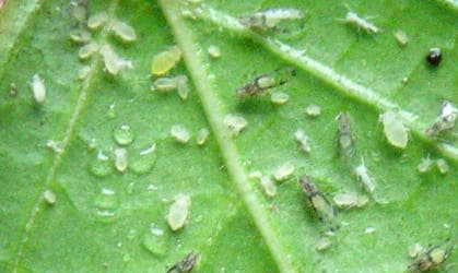 Spider Mites prefer evergreen needles but will eat pretty much anything. They especially like plants that are under drought stress. The mites are too small to see, but the damage they do is easy to see. You will observe stippling or dotting all over a leaf. The leaf color will be a lighter green or yellow. If you aren’t sure you’ve got mites there is an easy way to check: Shake the branch where you think they are and hold a sheet of paper underneath, they will sprinkle onto the paper.