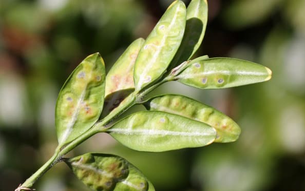 Leaf Miners go after the Boxwood trees. They bore into the leaf tissue to lay their eggs. When the larvae hatch they suck the nutrients out of the leaf. That’s when you see the leaves start to curl or turn brown. When they reach adult stage, they emerge from the leaf as colorless flies.