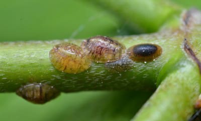 Scale is the most difficult insect pest to control and treat. The back of the scale insect acts as a shield that deflects sprayed pesticides (as well as insect predators). They keep their eggs underneath the scale. However, when the nymphs emerge from underneath that shield to feed on the host plant, that’s when they are vulnerable to the pesticide. So the timing of pesticide treatment is tricky.
